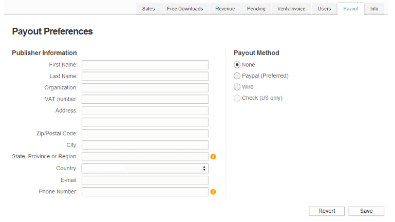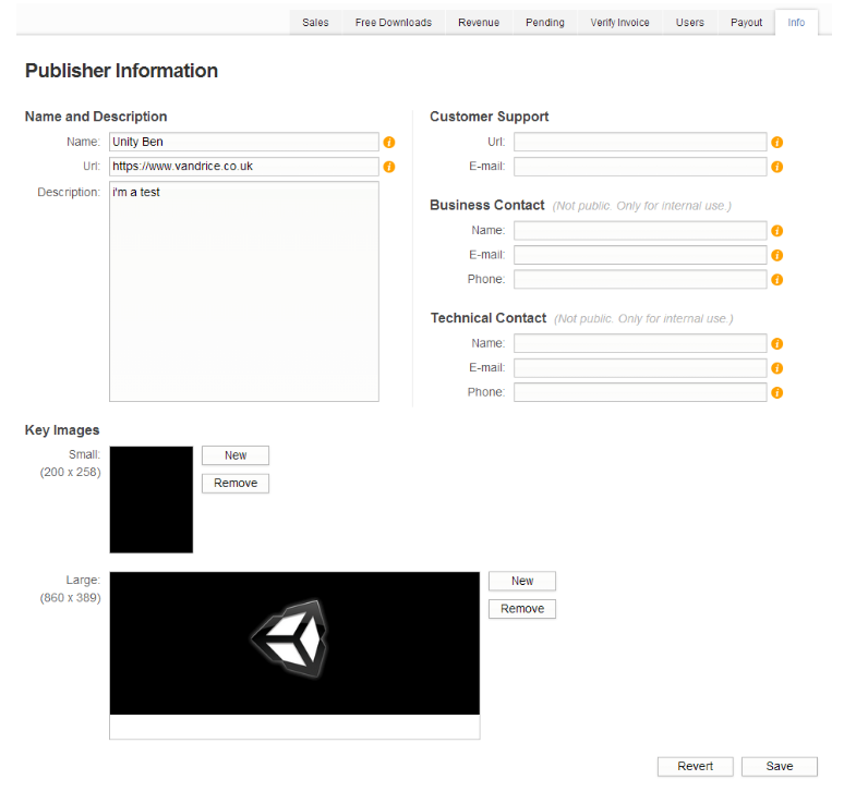 在 Info 选项卡中可以编辑发布者帐户的配置文件。该页面中的信息一目了然,但此处简要介绍一下这些部分: