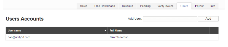 在 Users 选项卡中可以查看 Unity 帐户以及将帐户添加到 Publisher Admin 部分。这意味着,如果您有一个团队,则可以根据需要添加每个人的帐户。
