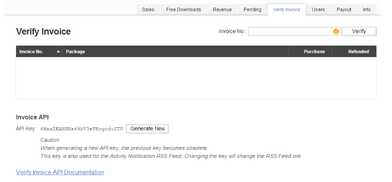 在 Verify Invoice 选项卡中可以输入 Asset Store 客户的发票号码以验证该发票是否有效。