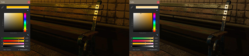 为光源选择正确的颜色时,请考虑所选颜色和值的影响。选择颜色时,尽量不要完全忽视任何一个颜色通道。否则会产生很难与白色点光源会聚的光。例如,虽然左下图中的光照颜色从技术上讲是一种有效的光照颜色,但会从最终输出中删除所有蓝色: