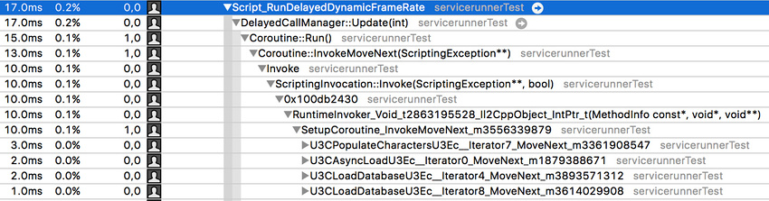 在上面的截屏中可以看到这种情况,其中的 DelayedCallManager 正在恢复几个不同的协程:PopulateCharacters、AsyncLoad 和 LoadDatabase 是其中需要注意的协程。