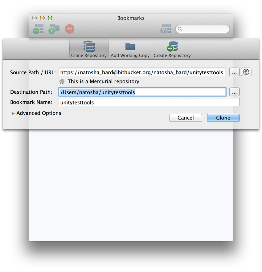 接下来,在本地克隆您的分叉,以便可进行修改。如果代码仓库是 Mercurial 代码仓库,则需要获取 Mercurial 客户端。如果是 Git 代码仓库,则需要获取 Git 客户端。Atlassian(Bitbucket 的所有者公司)维护着一个名为 SourceTree 的应用程序,该程序可在 Windows 和 OS X 上运行,并可与 Mercurial 和 Git 代码仓库结合使用。我们在 Unity 中大量使用 SourceTree 与我们自己的 Mercurial 代码仓库进行交互。请查看 MercurialGit 的下载页面以了解提供的不同选项。