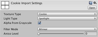 将剪影导入 Unity 后,从 Project 视图中选择该剪影,然后在检视面板中将 Texture Type 设置为 Cookie。除非您已经自己设计了图像的 Alpha 通道,否则还应启用 Alpha From Grayscale