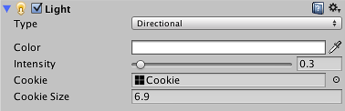 聚光灯和点光源直接根据锥体或球体的大小来缩放剪影。方向光有一个附加的 Cookie Size 选项可让您自行缩放剪影;缩放操作适用于 SpotlightDirectional 两种类型的剪影。