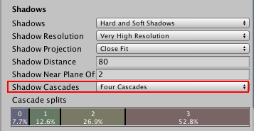 阴影贴图大小的这些分阶段缩减做法称为级联阴影贴图(有时称为“平行拆分阴影贴图”)。您可以从 Quality 窗口中为指定的质量级别设置零个、两个或四个级联。