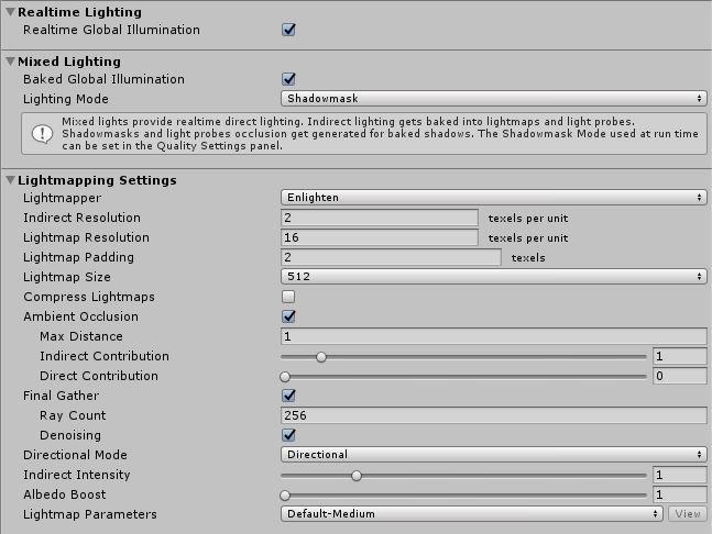 | Lightmapper | 指定用于计算场景中的光照贴图的内部光照计算软件。选项包括 Progressive 和 Enlighten。默认值为 Progressive__;将其设置为 Enlighten__ 便可以使用本页面中描述的系统。如果要使用 Progressive 系统,请参阅有关渐进光照贴图的文档。 |