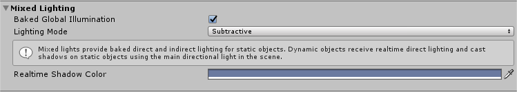 | Realtime Shadow Color | 定义用于渲染实时阴影的颜色。仅当 Lighting Mode 设置为 Subtractive 时,此设置才可用。 |