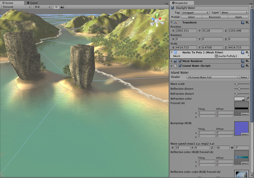 1.创建水的网格。此网格应该是一个水平定向的平面网格。不需要 UV 坐标。水游戏对象应使用水__层__(可在 Inspector 中设置)。 1.将 Water 脚本(来自于 Pro Standard Assets/Water/Sources__)附加到该游戏对象(可在 Inspector 中设置渲染模式:__Simple、Reflective 或 Refractive__)。 1.使用材质中的 FX/Water__ 着色器,或调整提供的水材质之一(__Daylight Water__ 或 __Nighttime Water__)。