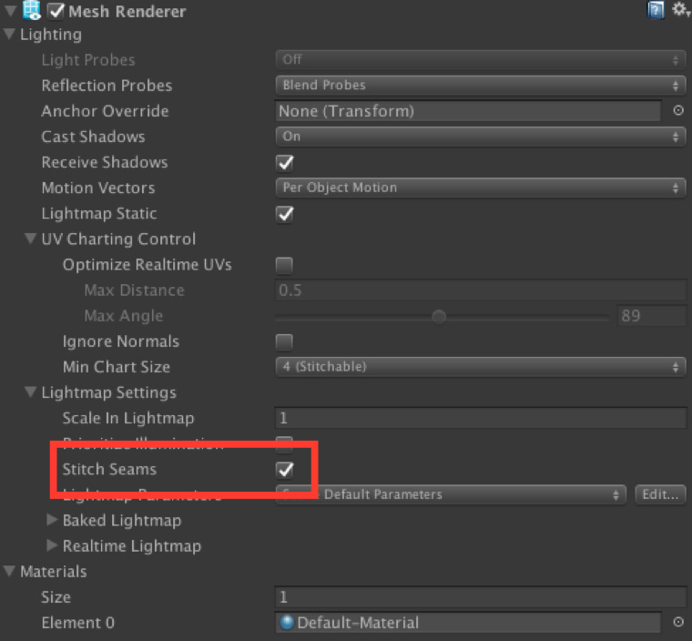 要在游戏对象上启用接缝缝合,请找到游戏对象的网格渲染器 (Mesh Renderer) 组件,打开 Lightmap Settings 部分(仅当使用渐进光照贴图时才能访问),然后勾选 Stitch Seams。