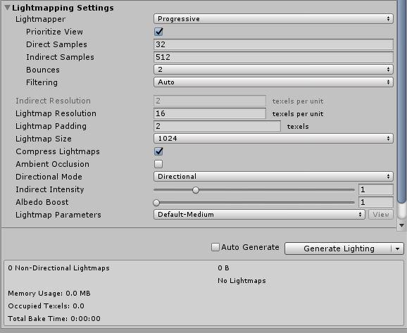 样本计数: 渐进光照贴图生成由单个光线产生的颜色值以便消除噪点。这些颜色值称为样本。有两种设置可控制渐进光照贴图用于直接和间接光照计算的样本数:__Direct Samples__ 和 Indirect Samples。要找到这两个设置,请打开 Lighting 窗口 (Window > Lighting > Settings),然后选择 Lightmapping Settings > Lightmapper。