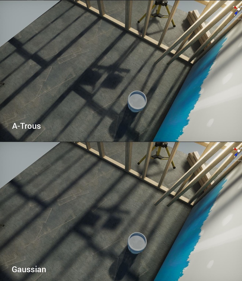 滤波可以模糊噪点效果。渐进光照贴图提供了两种不同类型的滤波:__Gaussian__ 和 A-Trous。启用 Advanced 设置后,可单独对 Direct、Indirect __ 和 Ambient Occlusion__ 应用这些过滤器。有关更多信息,请参阅有关渐进光照贴图的文档。
