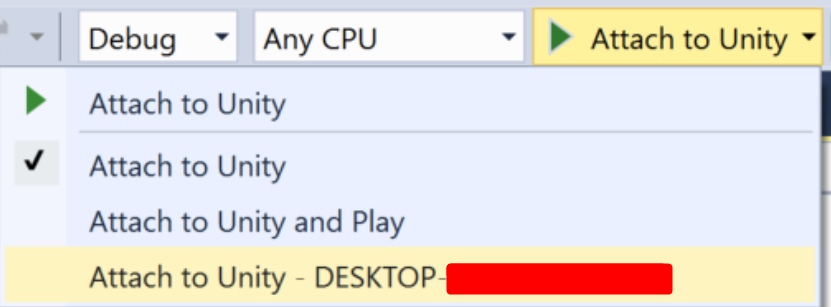 要将代码编辑器连接到 Unity Player,请选择 Player 的 IP 地址(或机器名称)和端口。在 Visual Studio 中,“Attach To Unity”选项的下拉菜单如下所示: