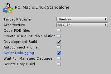 要调试在 Unity Player 中运行的脚本代码,请确保在构建 Player 之前启用“Development Build”和“Script Debugging”选项(这些选项位于 File > Build Settings 中)。启用“Wait For Managed Debugger”选项可使 Player 等待调试器连接之后再执行脚本代码。
