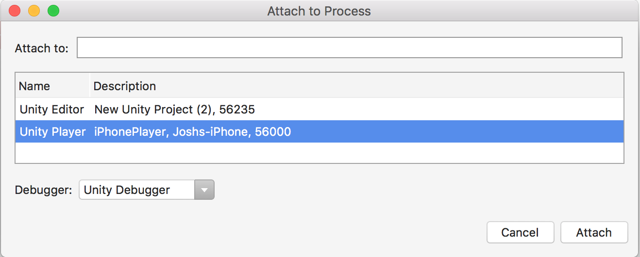 调试 iOS 设备上运行的 Player 时,请通过 TCP 连接到设备。例如,要在 Visual Studio (Mac) 中连接到 iOS 设备,请选择 Debug > Attach Unity Debugger 选项。此时将显示运行 Player 实例的设备列表: