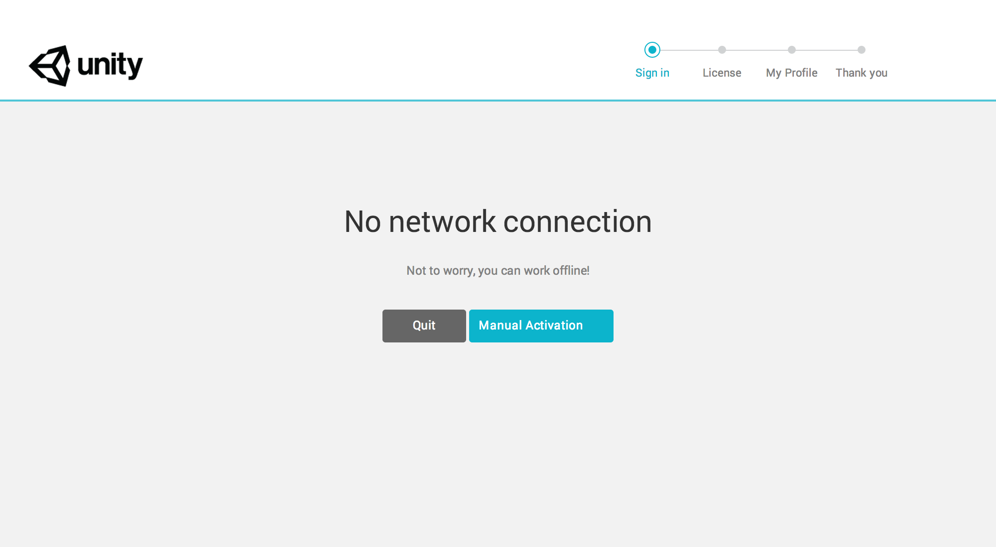 现在您已获得许可证请求文件,接下来的步骤需要访问互联网。如果您的计算机未接入互联网,则可以在已联网的计算机上激活许可证,方法是将文件复制到另一台计算机,按照以下步骤激活许可证,然后将文件复制回您的计算机即可使用 Unity。