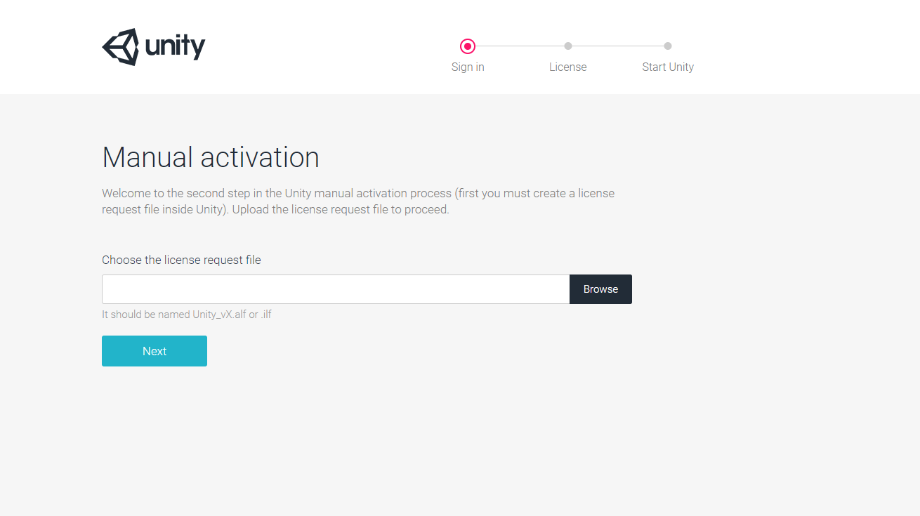 1. 访问 Unity 许可证 Manual Activation 网页。单击 Browse 按钮,选择先前在步骤 1 中创建的许可证请求文件,然后单击 Next