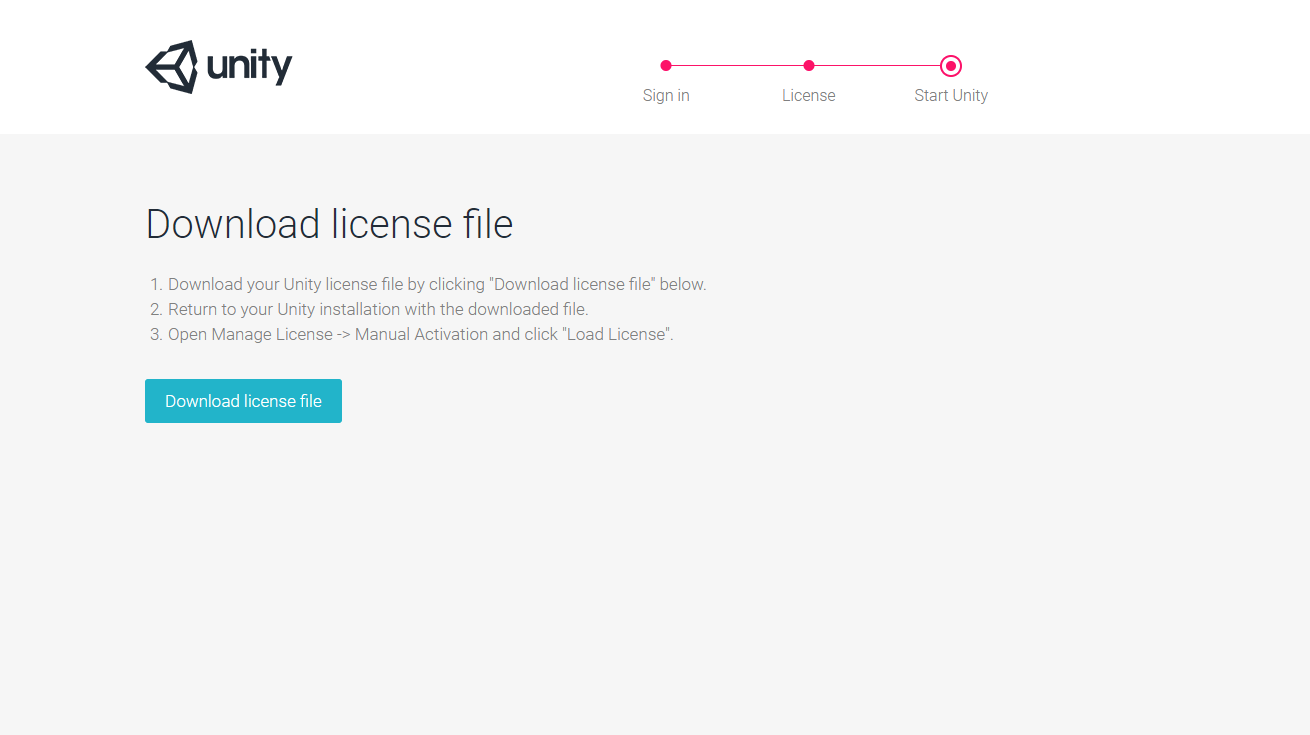 此时会将许可证下载到用于浏览该网站的计算机上。如果要激活 Unity 的是另一台计算机,而不是这台接入互联网的计算机,请记住将许可证传输到要激活 Unity 的计算机上。