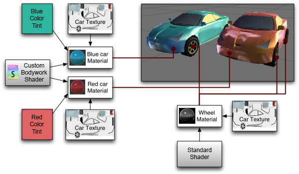 车身着色器还接受一种色调颜色;红色和蓝色汽车设置为不同的颜色,使每辆汽车的外观不同,但两者使用同一种纹理。
