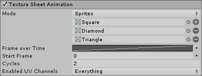 | 动画 (Animation) | Animation 模式可设置为 Whole Sheet 或 Single Row__(即精灵图集的每一行代表一个单独的动画序列)。 | | Time Mode| 选择粒子系统如何在动画中对帧进行采样。 | | Lifetime| 在粒子的生命周期内使用动画曲线对帧进行采样。 | | Speed| 根据粒子的速度对帧进行采样。速度范围指定选择帧的最小和最大速度范围。 | | FPS| 根据指定的每秒帧数值对帧进行采样。 | | Random Row| 随机从精灵图集选择一行以生成动画。仅当 Animation__ 模式设置为 Single Row 时,此选项才可用。 |