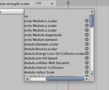 要动画化粒子系统属性,请打开 Animation 窗口__,并选择包含 Animator 和粒子系统的游戏对象。单击 Add Property__ 以添加属性。