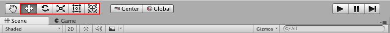 工具栏中的第一个工具__手形工具 (Hand Tool)__ 用于平移场景。移动 (Move)、旋转 (Rotate)、缩放 (Scale)、矩形变换 (Rect Transform) 和__变换 (Transform)__ 工具用于编辑各个游戏对象。要更改游戏对象的变换组件,请使用鼠标操纵任何辅助图标轴,或直接在 Inspector 中的__变换__组件的数字字段中输入值。