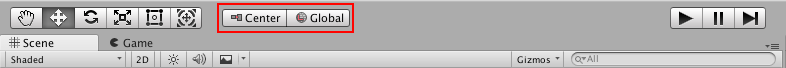 变换__工具组合了__移动、旋转__和__缩放__工具。该工具的辅助图标提供了用于移动和旋转的控制柄。当 Tool Handle Rotation__ 设置为 __Local__(见下方)时,变换组件工具还提供用于缩放所选游戏对象的控制柄。