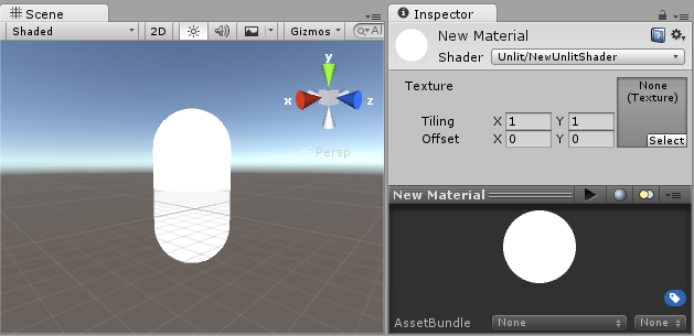 通过材质的检视面板使材质使用着色器,或者在 Project 视图中将着色器资源拖动到材质资源上。材质检视面板在使用此着色器时将显示白色球体。