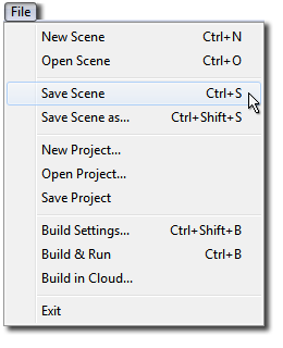 要保存对场景的更改,请从 File 菜单中选择 Save Scene,或按 Ctrl/Cmd + S。 这样可以保存当前对场景的更改执行“Save Project”(见下文)。