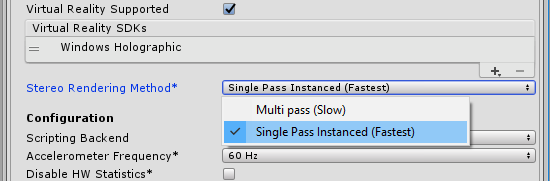 要启用此功能,请打开 Player 设置(菜单:__Edit__ > Project Settings__,然后选择 Player__ 类别)。然后,导航到 Other Settings 面板,启用 Virtual Reality Supported 属性,然后从 Stereo Rendering Method 下拉菜单中选择 Single Pass Instanced (Fastest)