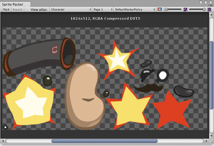 如果打开 Sprite Packer 窗口(菜单:__Window__ > 2D > Sprite Packer__)并单击左上角的 Pack__ 按钮,则会显示图集内包含的纹理排列结果。