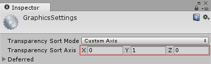如果 Transparency Sort Mode 设置为 __Custom Axis__,则 Scene 视图中的渲染器将根据此轴与摄像机之间的距离进行排序。应使用介于 –1 和 1 之间的值来定义此轴。例如:X=0、Y=1、Z=0 将此轴方向设置为向上。X=1、Y=1、Z=0 将此轴方向设置为 X 和 Y 之间的对角线方向。