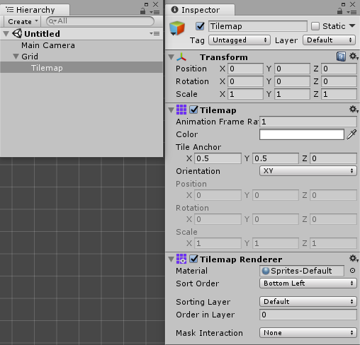 Tilemap 子游戏对象由 Tilemap 组件和 Tilemap Renderer 组件组成。Tilemap 游戏对象是绘制瓦片的地方。
