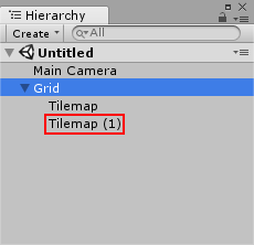 选择 Tilemap 选项后,在场景中将会创建一个新的 Grid 游戏对象,其中包含 Tilemap 子游戏对象。Grid 游戏对象决定了其子 Tilemap 的布局。
