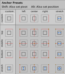 在 Inspector 中,可在矩形变换组件的左上角找到 Anchor Preset 按钮。单击该按钮将显示 Anchor Presets 下拉选单。从此选单中可以快速选择一些最常用的锚定选项。可将 UI 元素锚定到父项的边或中间,或者与父项大小一起拉伸。水平锚定和垂直锚定是独立的。