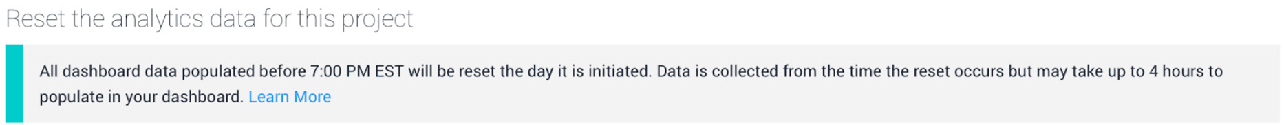 需要重置 Analytics 项目数据的主要情况是在游戏上市(或重新发布游戏)之前从控制面板中清除数据。这种做法可以确保重置后收集的数据是干净的,而不会与以前收集的数据混淆(混淆在一起可能会导致分析出现偏差)。