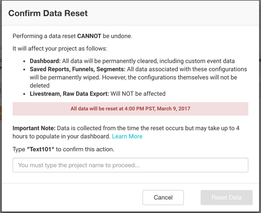 Reports, Funnels, Segments(报告、漏斗图、细分段):从控制面板中永久擦除与这些配置(在项目中已创建的配置)相关的所有数据。但是,不会删除这些配置本身。例如,如果创建包含三步的漏斗图,为其填充数据,然后执行数据重置,则此三步式漏斗图仍然会存在于控制面板中,但不再包含数据。