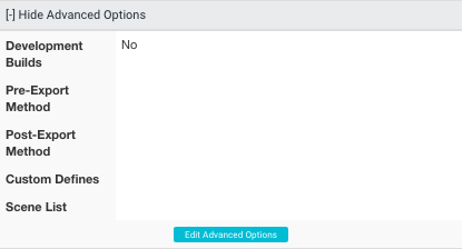 所有高级选项都是针对每个编译目标进行设置的。这意味着,例如,单击某个 iOS 目标的 Advanced Options 链接时,这些选项仅适用于该 iOS 目标。单击某个 Android 目标的 Advanced Options 时,这些选项仅适用于该 Android 目标。因此,您可以针对每个编译目标为每个平台使用不同的预处理和后处理方法。