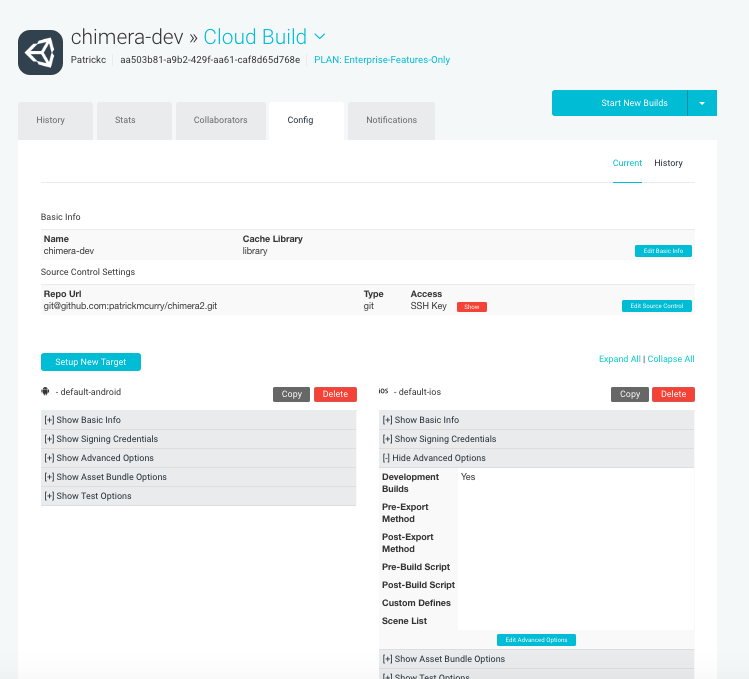 要访问编译目标的高级选项,请转至 Unity 开发者网站。选择您的项目,进入项目的 Unity Cloud Build 部分,然后选择 Config 选项卡(如下所示)。