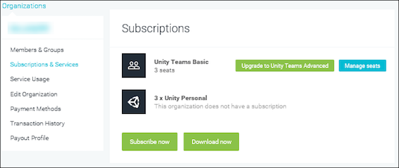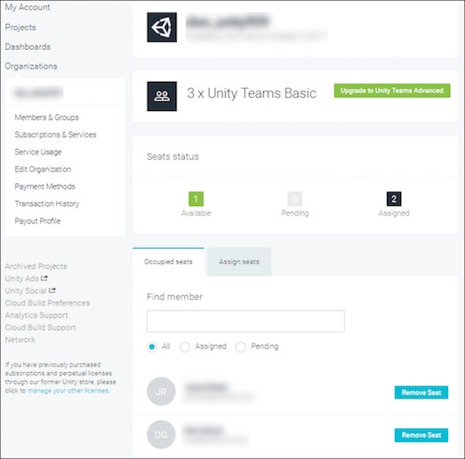 选择 Unity Teams 订阅,然后单击 Manage seats。