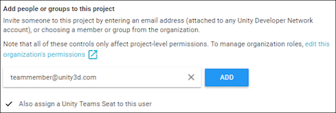 要将用户添加为组织中的访客,请单击 ADD。这样会向用户分配一个 Unity Teams 席位。