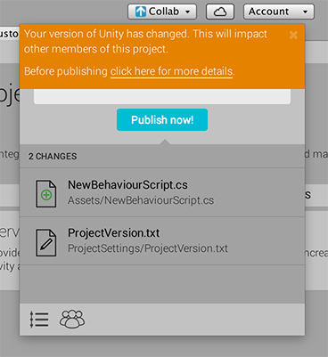 Unity Collaborate 会验证即将用于发布更新的 Unity 版本是否与 Collab History 窗口中显示的最新更新在发布时所用的 Unity 版本相匹配。如果版本不匹配,Unity 会显示以下警告: