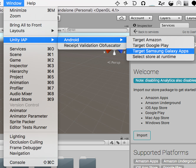 3.要在 Unity Editor 中设置 IAP 目标商店,请转至 Window > Unity IAP > Android > Target Samsung Galaxy Apps。