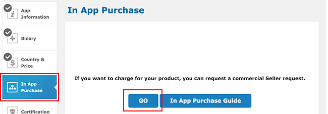 3.要启用 IAP,请先注册一个二进制 APK。转至 In App Purchase__,然后单击 GO__。