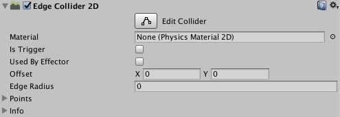 | Edge Radius | 控制边缘周围的半径,使顶点为圆形。这会产生一个具有圆凸角的更大 2D 碰撞体。此设置的默认值是 0__(无半径)。| |Points__ | 有关生成碰撞体的复杂性的不可编辑信息。 |