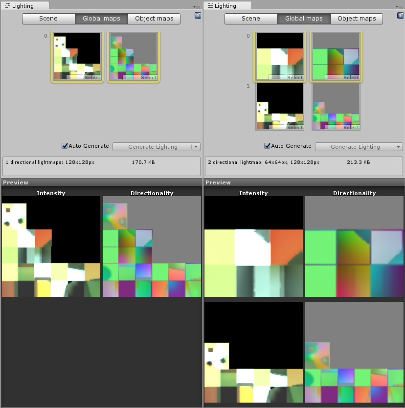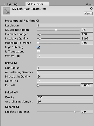 光照贴图参数资源可以用来为不同类型的游戏对象或为不同平台和不同场景类型(例如,室内或室外场景)创建优化的预设。