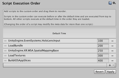 可使用加号“+”按钮将脚本添加到 Inspector 中,并可通过拖动来更改其相对顺序。请注意,可以将脚本拖动到 Default Time 栏的上方或下方;上方的脚本将在默认时间之前执行,而下方的脚本将在默认时间之后执行。对话框中从上到下的脚本顺序决定了脚本的执行顺序。不在对话框中的所有脚本都以任意顺序在默认时隙中执行。
