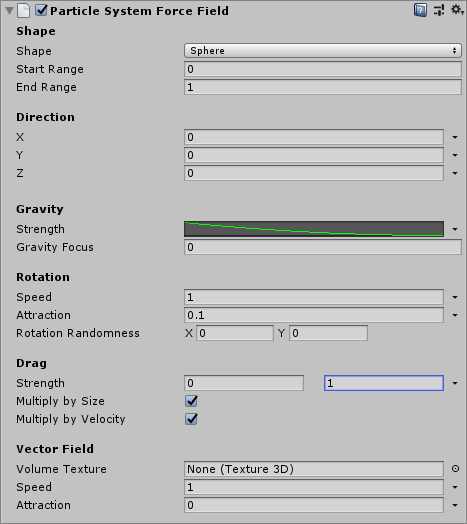 | Attraction | Unity 将粒子拖入矢量场运动的强度。该值越大,吸引力就越大。可指定恒定吸引力或随时间改变的吸引力。请参阅随时间推移而变化的属性。 |