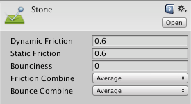 | Static Friction | 当对象静止在表面上时使用的摩擦力。通常为 0 到 1 之间的值。值为零就像冰一样,值为 1 将导致很难让对象移动。 |