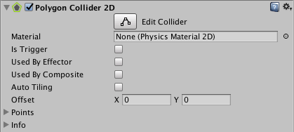 | Used by Composite | 如果希望此碰撞体由附加的 2D 复合碰撞体 (Composite Collider 2D) 使用,请勾选此复选框。 启用 Used by Composite 时,其他属性会从 2D 多边形碰撞体组件中消失,因为这些属性现在由附加的 2D 复合碰撞体控制。从 2D 盒型碰撞体消失的属性为 Material、Is Trigger、Used By Effector 和 Edge Radius。 |
