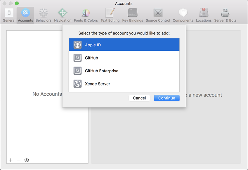4.单击左下角的加号,并从出现的窗口中选择 Apple ID__,然后单击 Continue__。